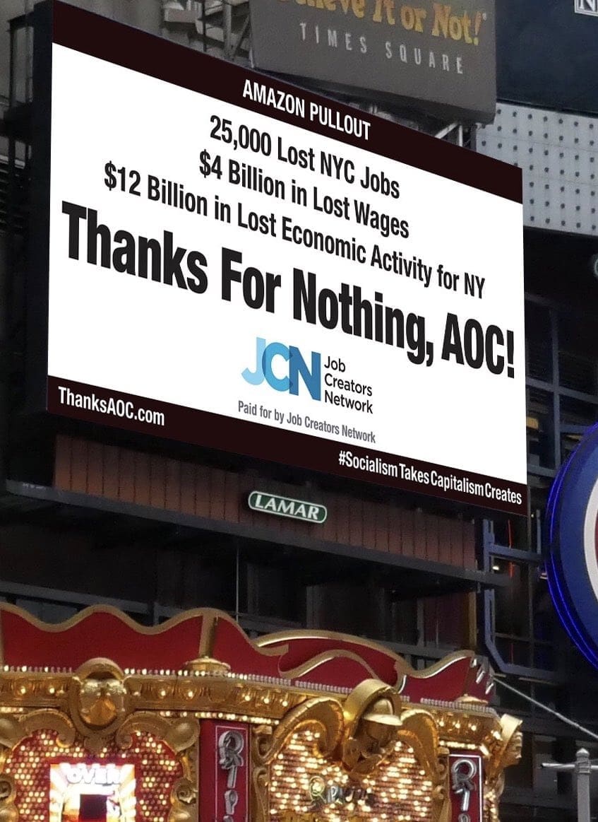 Amazon’s decision to ding a planned New York campus will cost the city thousands of jobs and billions of dollars in lost economic activity, the billboard claims.
