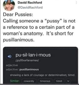 Merriam-Webster–Do you know someone who has a small, weak spirit, someone whose reserve of inner strength is too small to draw from in times of danger and adversity? If so, you’ll find pusillanimous to be the perfect descriptor for that person. The Latin roots of this derisive adjective are pusillus, meaning “very small” (and related to pusus, meaning “boy”) and animus, which means “spirit” and is the ancestor to many words in our language, including “animal” and “animate.” Pusillanimous first appeared in English in the 16th century, but it gained prominence in the 1970s when Vice President Spiro Agnew famously accused his ideological rivals of “pusillanimous pussyfooting.” And despite what you may have heard, pusillanimous does not serve as the basis for pussyfoot, pussycat, or a certain related vulgarism.