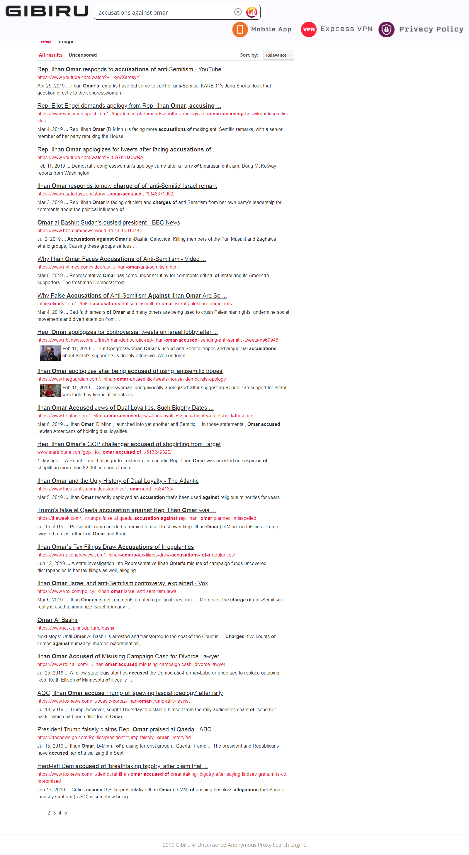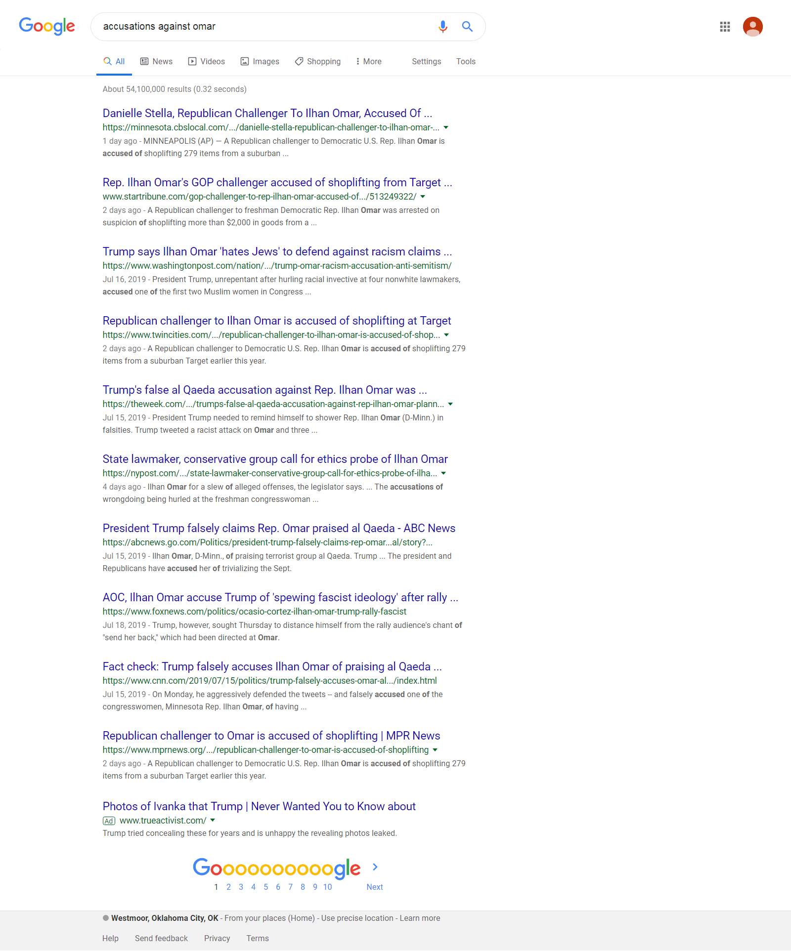 These are the search results from 07/28/2019 of the search term “accusations against omar” on Google, DuckDuckGo, Bing, and Gibiru search engines. Google reports primarily of 1- Accusations against Omar opponent 2- Fact check defenses of accusations against Omar 3 – Blaming Trump of making false accusations against Omar.