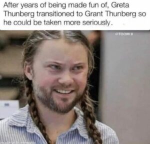 Greta Thunberg, “I’d Grow A Penis And A Pair Of Balls For The Climate.” September 26, 2022September 26, 2022 by rainman The new ‘Grant/Greta’ was overheard saying, “I’d give my left nut/ovary for another wind turbine.”