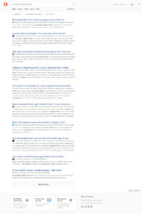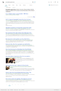 These are the search results from 07/28/2019 of the search term “accusations against omar” on Google, DuckDuckGo, Bing, and Gibiru search engines. Google reports primarily of 1- Accusations against Omar opponent 2- Fact check defenses of accusations against Omar 3 – Blaming Trump of making false accusations against Omar.