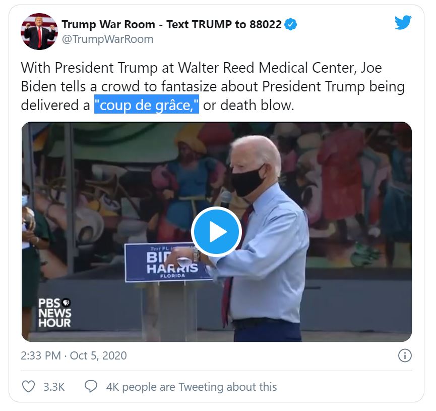 Gateway Pundit–Joe Biden has told reporters that he doesn’t want to attack President Trump while he’s in the hospital, but here he is today telling Haitians to fantasize about Trump being delivered a death blow.