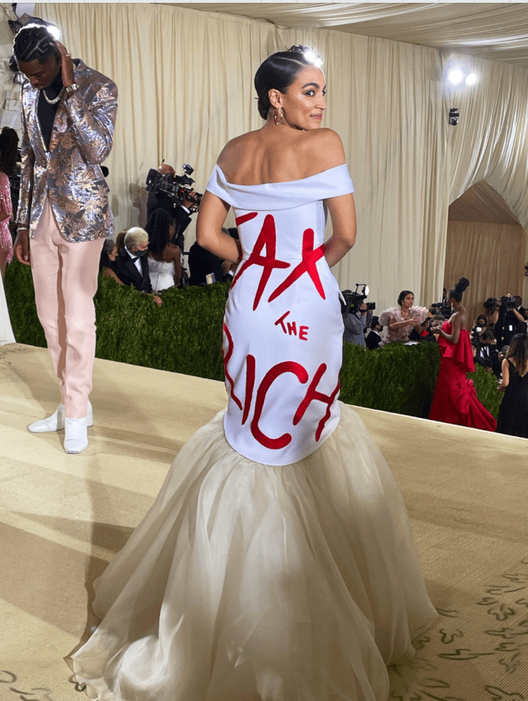 IQ By AOC – Let’s Attend A $30,000 A Seat Gala Ball Wearing A Designer Dress Themed “Tax The Rich” September 14, 2021 by rainman The irony is deep with this one, Obi Wan… AOC Wears a High End Designer ‘Tax The Rich’ Dress to $30,000 Per Ticket Met Gala