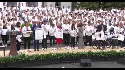 Biden stood with a group of Olympic and Paralympic athletes while celebrating the athletes, who participated for Team USA during either the Tokyo 2020 Summer Games or the 2022 Beijing Winter Games.