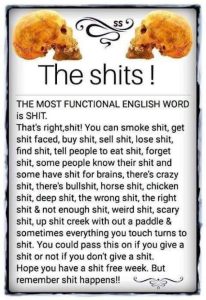 Shit – A Most Functional Word… January 18, 2024 by rainman With A ‘Shit Ton’ of uses, and more being discovered every day. And then there’s ‘Effing Shit for Brains, Poopy (shit’s first cousin) pants Joe Biden