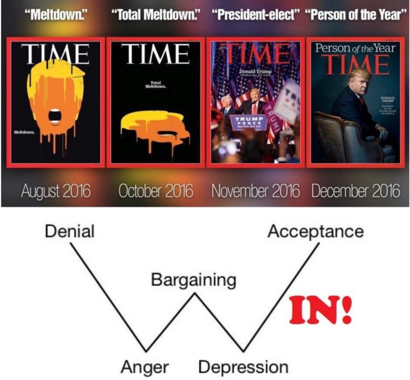 5 Stages of MSM Grief December 16, 2016December 16, 2016 by rainman Unfortunately, ‘Acceptance’ has no morphed into ‘Passive-Aggression’. There will be no rest for the “Trumpster”.