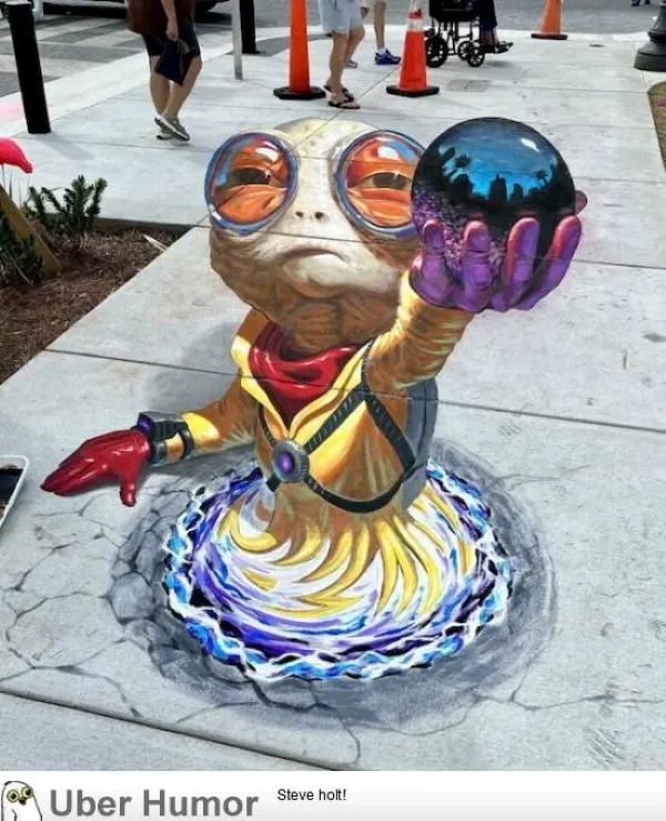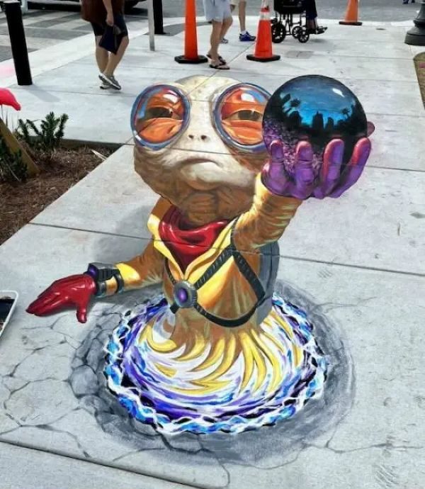 StreetArt – Glowing Blue Ball October 11, 2025 by rainman The image shows a 3D street painting, which is a form of anamorphic art that creates a three-dimensional illusion when viewed from a specific angle. This particular artwork was created by Chris Carlson, a Denver-based 3D chalk artist.
